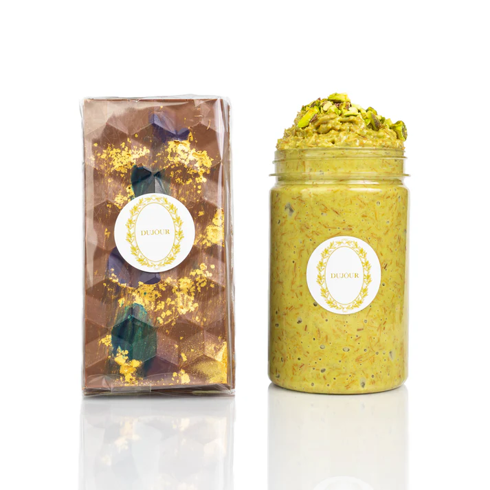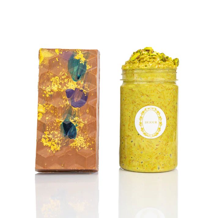Disfrute de la mejor experiencia de postre con nuestro Pistacho Knafeh Chocolate Bar & Crunchy Spread Bundle, inspirado en los ricos e icónicos sabores de Dubai. Este lujoso set combina el sedoso chocolate con leche con una crujiente pasta de pistacho y nueces para ofrecerte un momento dulce que querrás revivir una y otra vez.