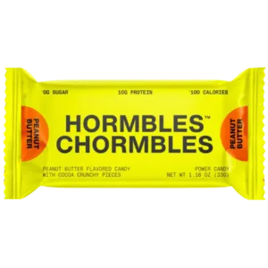 Hormbles Chormbles Peanut Butter Protein Candy Bars offer a creamy peanut butter flavor combined with crunchy cocoa bits for an indulgent snack experience. Each bar delivers 10 g of protein, 0 g of sugar, and 100 calories, making it a satisfying, guilt‑reduced treat that balances taste and nutrition.